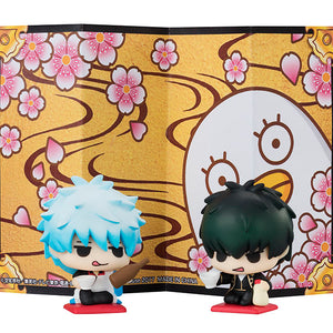 The set includes chibi figures of both Gintoki and Hijikata sculpted as if enjoying a drinking game together. The set includes a folding screen to bring out the atmosphere of the scene even more!